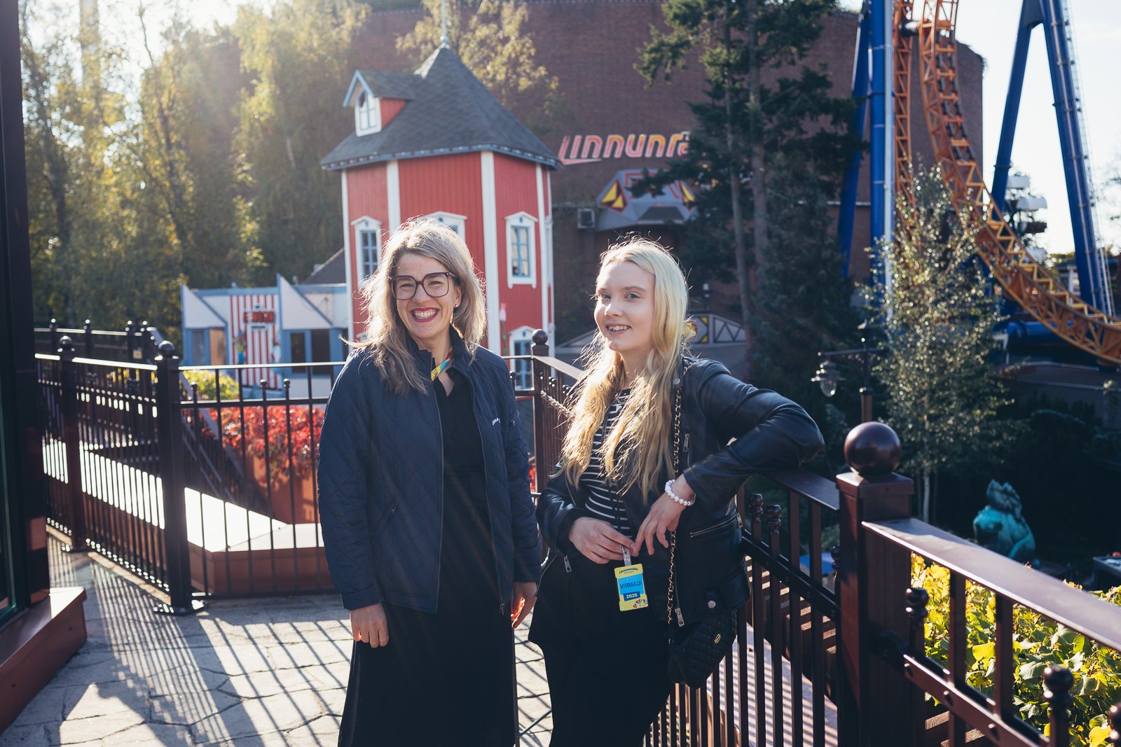 Ammattiopisto Lappian opiskelija Saara Vartiainen Torniosta vietti iloisen työpäivän Linnanmäellä yhdessä Lasten Päivän Säätiön palvelujohtaja Niina Häkkisen kanssa.
